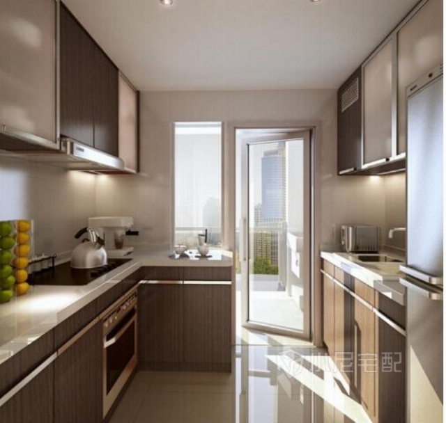 廚房功用是貯存食物必備,為日常生活供給餐飲的確保。按廚房的功用可分為以 下區(qū)域:貯存、洗刷和烹調(diào)。一般又把這三個區(qū)域所構(gòu)成的三個點所構(gòu)成的三角形稱為廚房作業(yè)三角形,思考表現(xiàn)廚房的功用性。由于廚房空間細(xì)長,底柜規(guī)劃側(cè)重表現(xiàn)精約個性,盡管方式看似簡略,但每個抽屜內(nèi)部是不盡相同的使用各種內(nèi)置式抽屜和金屬拉藍(lán),給主人供給了便利的操作空間。