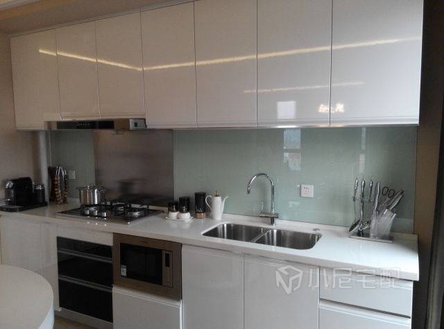 廚房一角,烤漆整體廚房,背漆玻璃加不銹鋼板的中空設(shè)計(jì)體現(xiàn)出年輕人的時尚