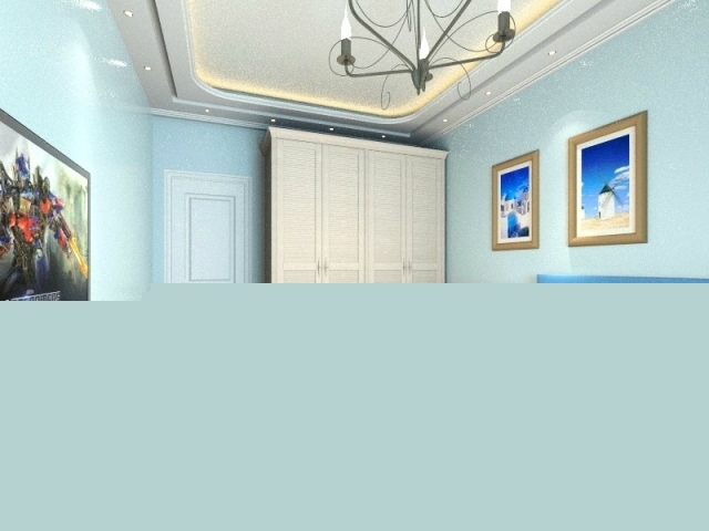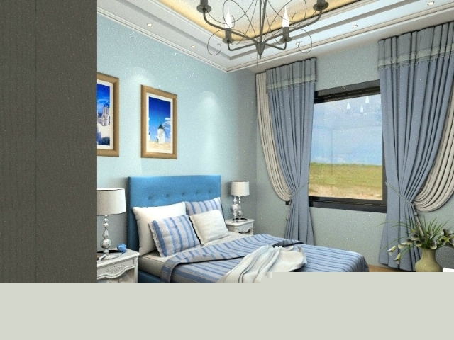 次臥,純白的歐式臥室家具搭配淺藍(lán)壁紙,色彩明快。