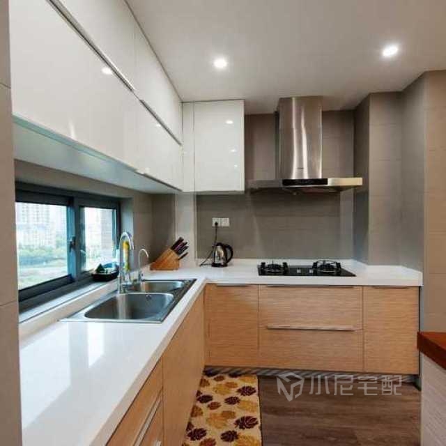 廚房吊柜選擇了白色跟原木色,現(xiàn)代感十足。