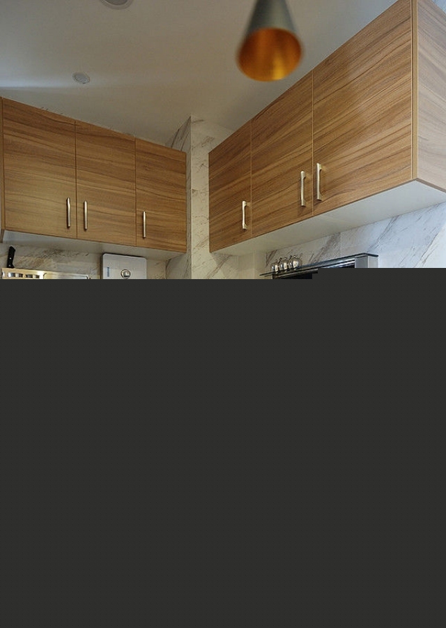 開放式小廚房,原木紋理在昏黃的燈光的照射下,覺得暖暖的。