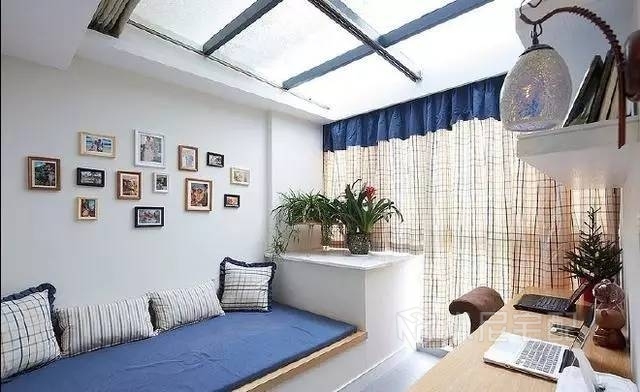 這個(gè)陽(yáng)光書房由大陽(yáng)臺(tái)改造而來(lái),搭建玻璃天窗,增強(qiáng)采光,藍(lán)白色調(diào)營(yíng)造出地中海式的自然浪漫。