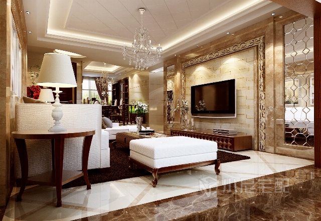 沙發(fā)背景石材上墻以呼應(yīng)電視背景的效果,呈現(xiàn)整體感。