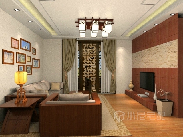 電視墻與電視柜的格調(diào)與中式家具相搭配,營(yíng)造和諧景象。
