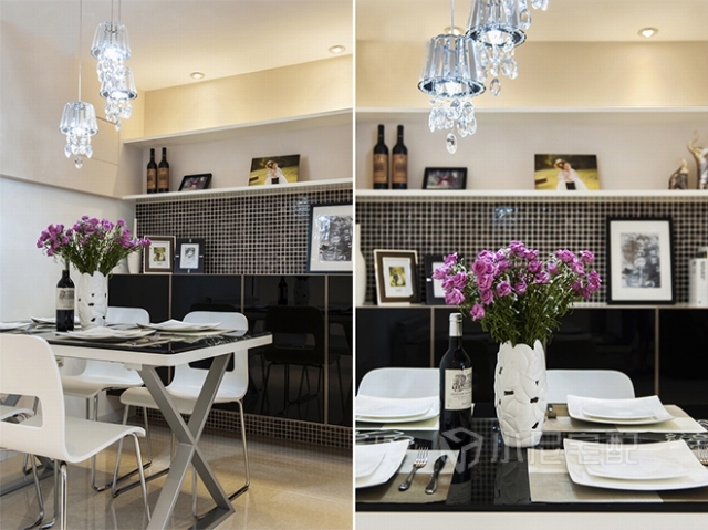 黑色餐桌搭配白色餐桌,擺上一盆白瓷瓶花,吃飯也變得很有feel~