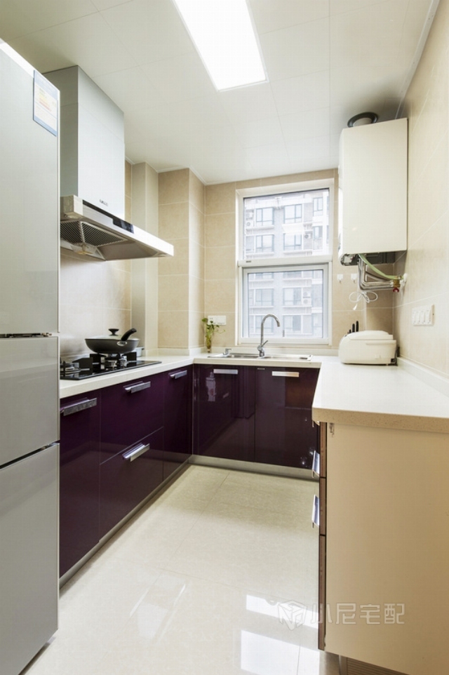 廚房不大,白色臺(tái)面搭配紫色柜體,有一股淡淡的高貴感。