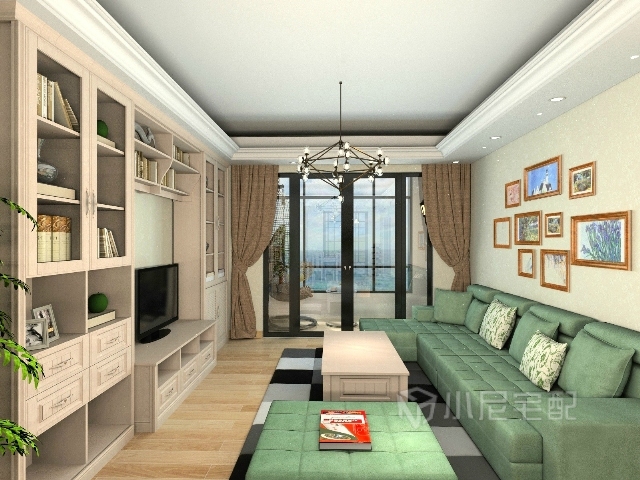 這套簡單電視柜、書柜加茶幾,配上這套綠色的沙發(fā),讓空間變的春意盎然。