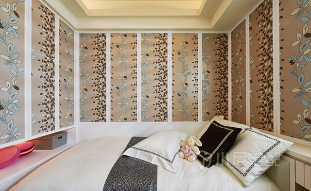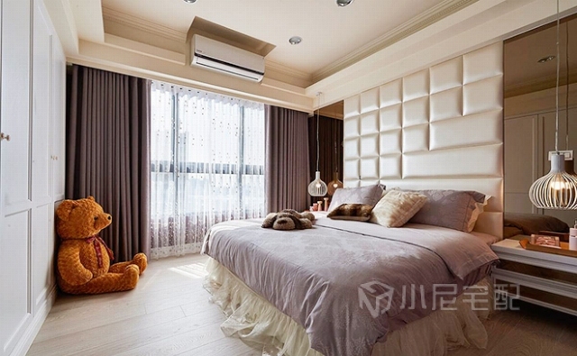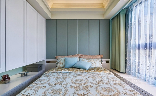 窗邊柱體納入床頭繃布規(guī)劃,并結(jié)合臥榻柜體使用。