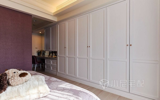 成排的衣柜底端設(shè)置化妝臺(tái),消弭狹長(zhǎng)感。