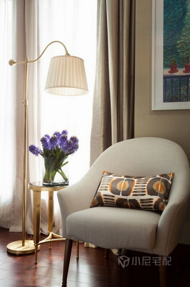 家具追求平衡與樸素的規(guī)整美,因為臥室是休息的地方,所以外形需要傳達一種平穩(wěn)與和諧。床品選擇絲質與花朵圖案,折射出女性的氣息。