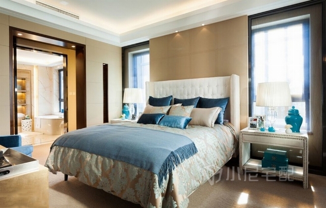 在臥室設計中,設計師把色彩演繹得更加純粹。不同的藍以簡約的造型凸顯環(huán)境的干練和素雅。家具追求平衡與樸素的規(guī)整美,因為臥室是休息的地方,所以外形需要傳達一種平穩(wěn)與和諧。