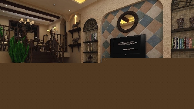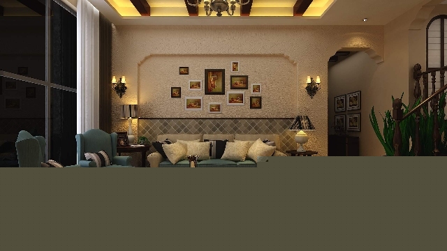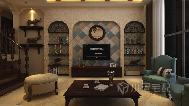 客廳 電視背景墻用藍、白、粉三色拼接而成,藍色的沙發(fā)墊巧妙呼應,
