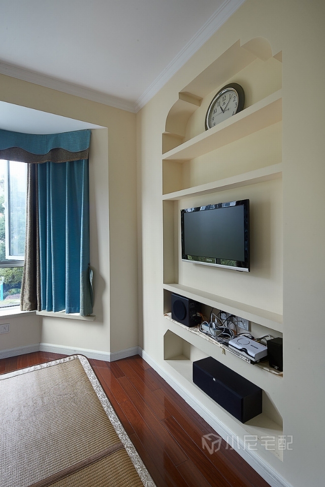 臥室簡約的電視背景墻,上面的架子還可以用來放書和小飾品奧。