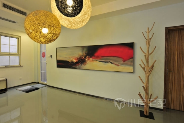 進(jìn)門玄關(guān)的壁畫藝術(shù)感十足,與造型獨(dú)特的燈飾和掛衣架相呼應(yīng)。