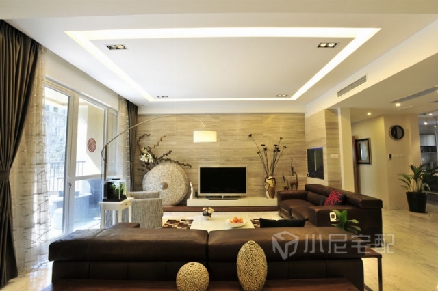 客廳在各個(gè)角落電視背景墻旁都放了綠植和假花,讓整個(gè)空間看起來大氣而又不單調(diào)。