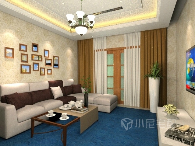 客廳為了不使人感到顏色單一,地毯采用藍色,突出眼球。