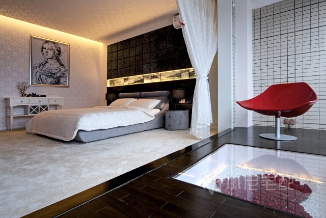 溫馨的臥室燈帶里的玫瑰花、名家的素描和黑白海景圖案,仿佛一場春華夢境。