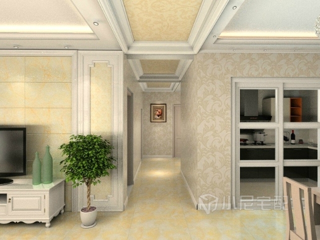 電視背景墻采用白色裝飾+壁紙+瓷磚的工藝,墻面瓷磚和地轉(zhuǎn)能夠呼應(yīng),中間用白色電視柜過度