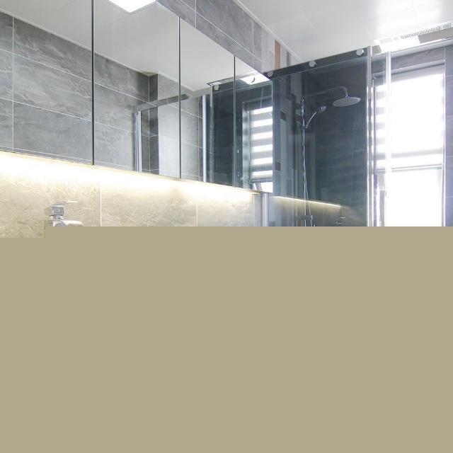 原本瘦長形的衛(wèi)生間,大面鏡柜讓空間視野有延伸感,深灰色墻磚顯得冷靜,磚面紋理讓人有在石灘行走的感覺。
