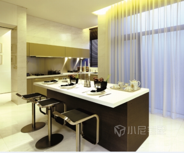 金屬色澤的櫥柜,白色的輕紗,柔和的燈光,洋溢著浪漫的氛圍