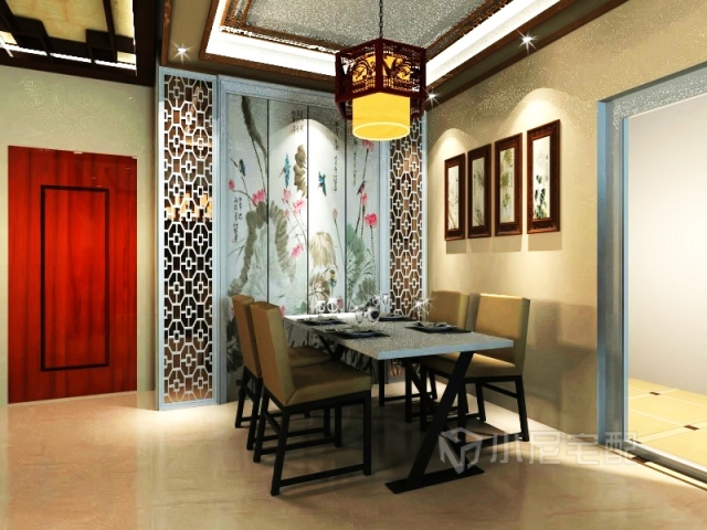 白色鏤空背景墻,舒適的中式餐椅,盡顯大方