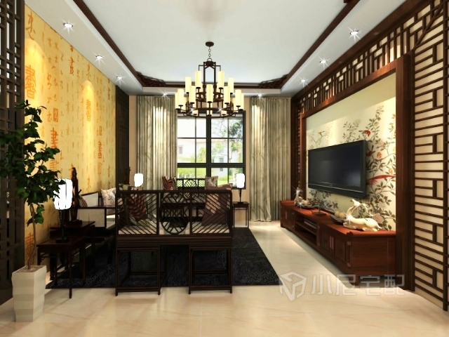淺色系窗簾和深棕色的家具以及造型電視背景墻綜合搭配,把中式特點(diǎn)表現(xiàn)的淋漓盡致