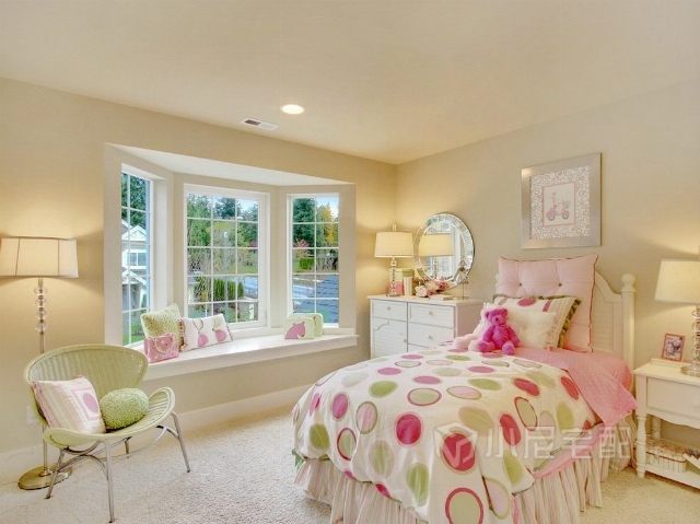 花色裝飾讓潔凈了空間里充滿活力,地毯的使用和床鋪棉花糖般的柔軟在私密空間里的布置讓人感受到滿滿的呵護。