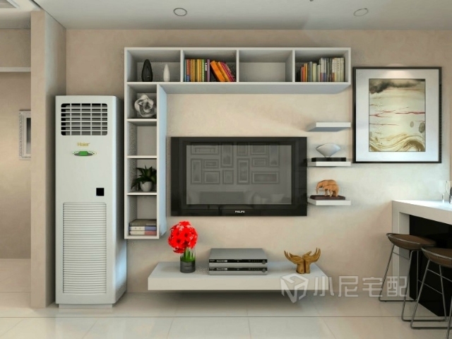 電視墻使用柜子,客廳雖小但儲(chǔ)物空間足夠,格架和板架可放置不同物品,同時(shí)避免造型過于單一。
