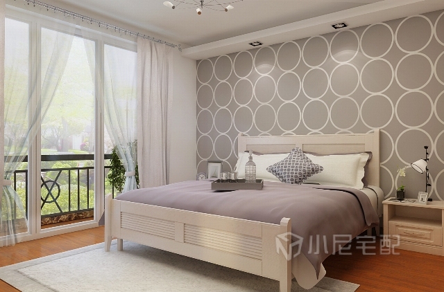 灰色圓圈的壁紙顯得輕松活潑,與床和床頭柜干凈利落的線型成對(duì)比,增加了空間的幾何感。