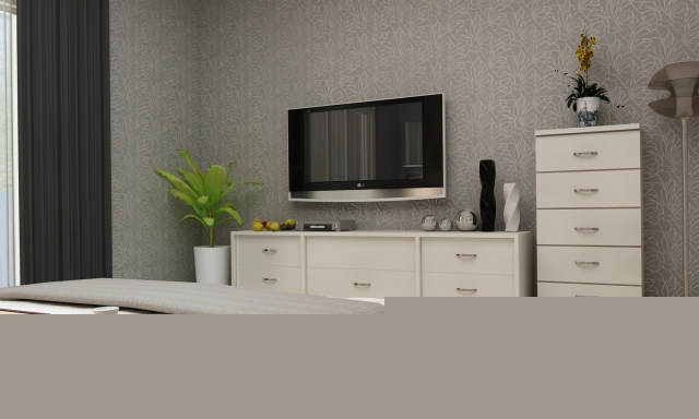 白色現(xiàn)代的電視柜與床相搭配,多層屜柜增加了臥室的儲(chǔ)物功能。