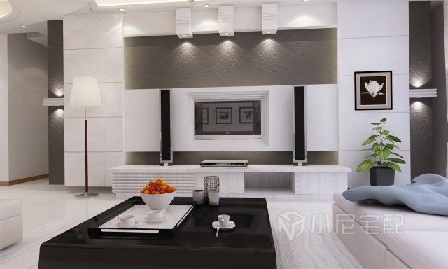 簡(jiǎn)潔的電視背景墻,使單一的墻面富有立體感,利用射燈使空間富有層次和變化。
