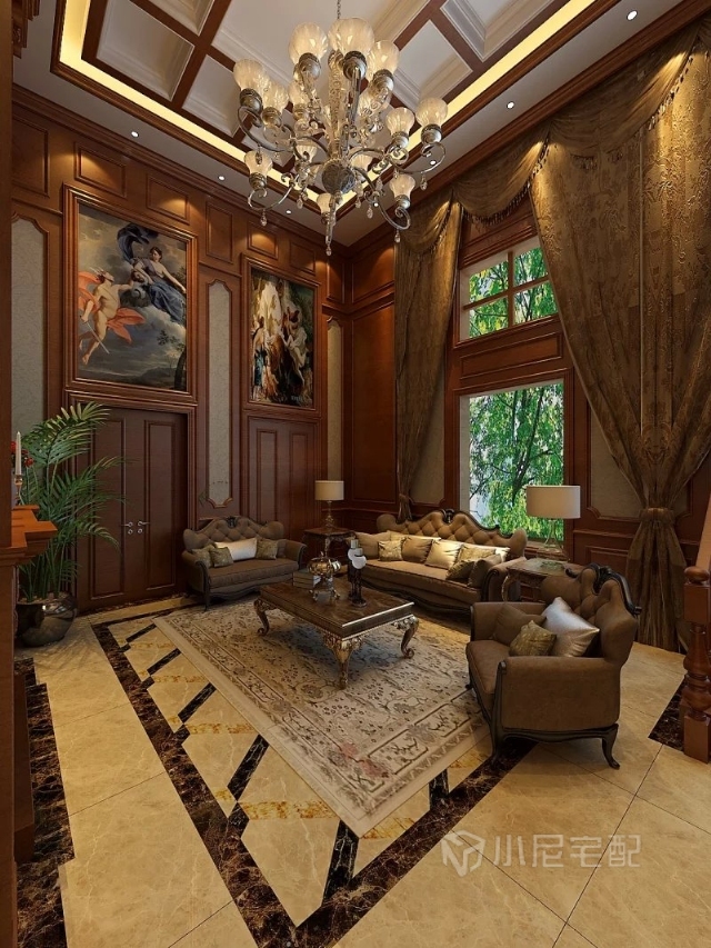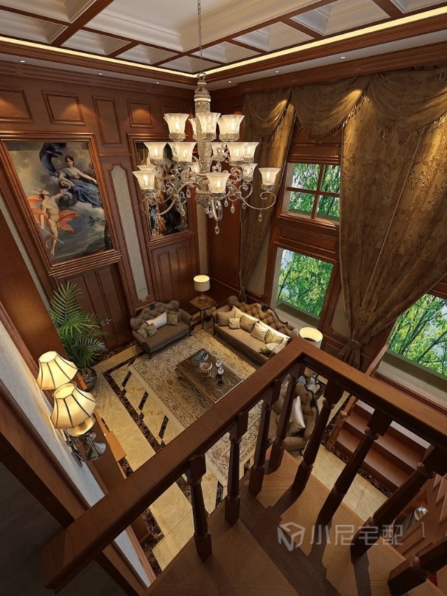客廳頂部用大型燈池,有花紋的石膏線(xiàn)勾邊