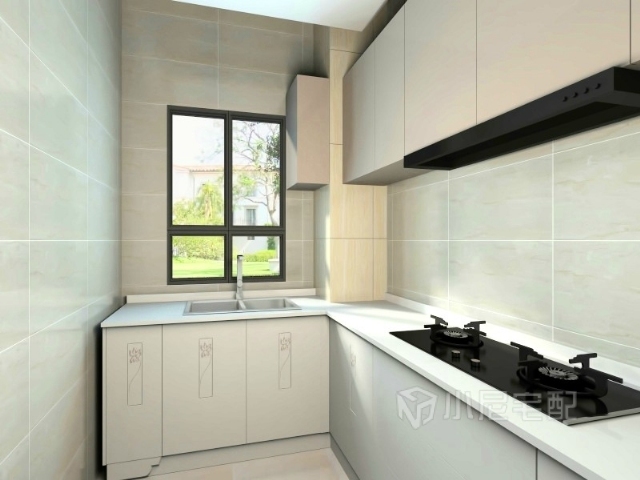 廚房也配合整體色調(diào)用了白色,L型廚房使小空間有了更多的實(shí)用功能。