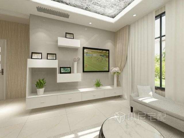 電視墻比較簡(jiǎn)單,幾個(gè)不同層次的掛柜放一些裝飾擺件,趣味十足,一排抽屜柜增加實(shí)用性。