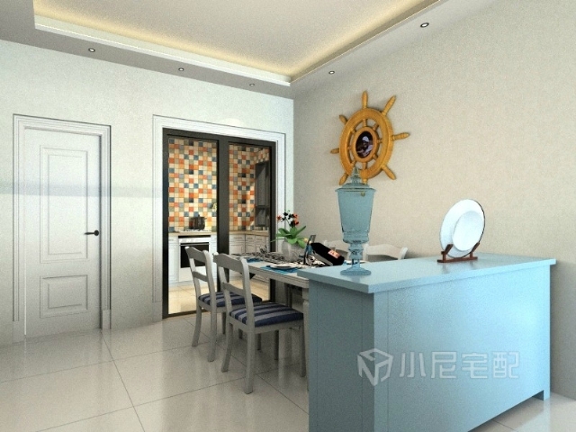空間主要以藍(lán)色白色為主調(diào),精美的裝飾物使空間有錦上添花的作用,使人眼前一亮,整個氣氛既溫暖又休閑。