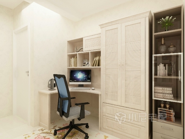 書(shū)房:采用木色書(shū)柜書(shū)桌,空間布局突出整體性,色調(diào)溫暖,給人簡(jiǎn)潔、明亮的通透感
