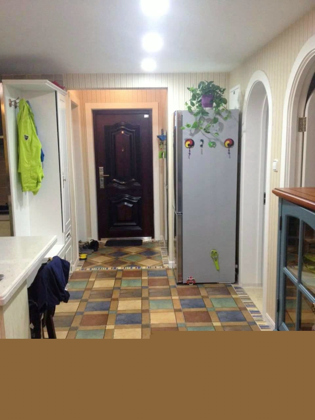 入戶位置,地面菱形鋪貼,配合彩色波打線,頂部石膏線和地中海風情吸頂燈。