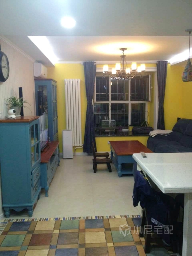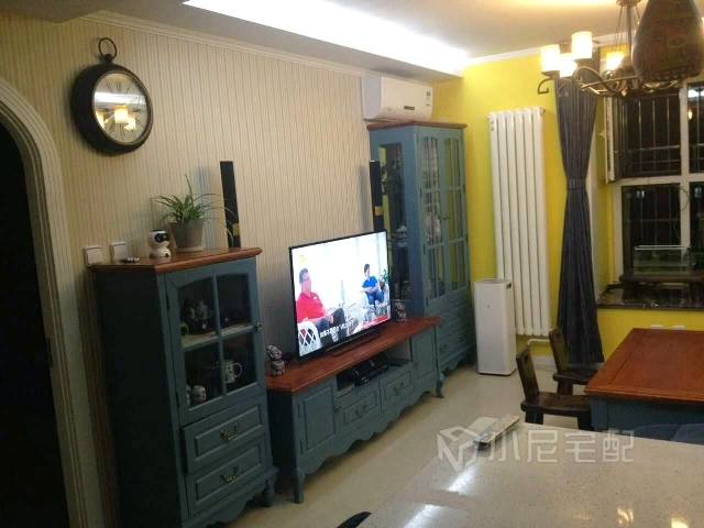 客廳黃色墻面、藍色電視柜