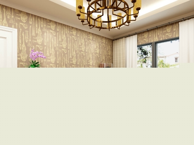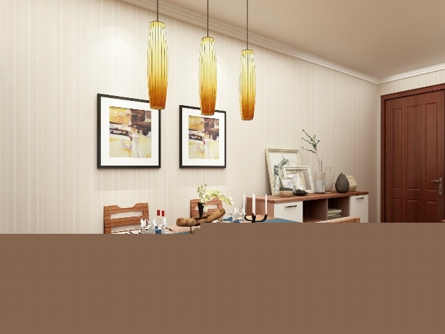 簡(jiǎn)單的掛畫,橘色的長(zhǎng)線吊燈,淡雅的條紋壁紙,一套餐桌椅,一個(gè)餐邊柜就營(yíng)造了一個(gè)非常舒適的就餐環(huán)境。