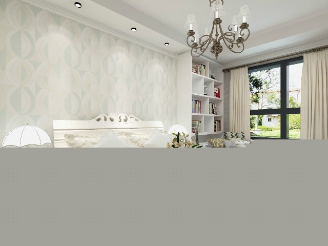 淡綠色花紋壁紙?jiān)黾恿藭r(shí)尚感,優(yōu)美的花紋,鐵藝的吊燈,增加了臥室的古典氣息。