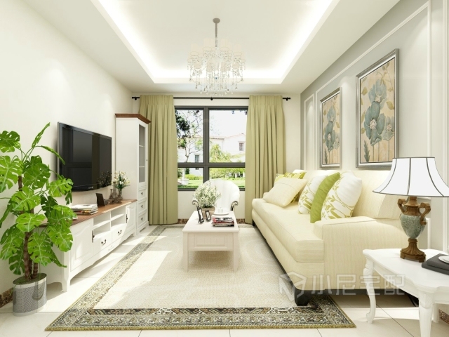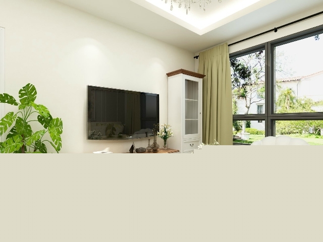 白色田園風(fēng)格的電視柜組合,綠色的植物增加整個(gè)空間的活力。