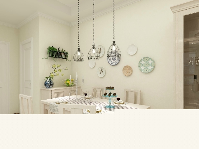 鐵藝長線吊燈,白色橡木的餐桌椅,表現(xiàn)出悠閑,舒暢,自然的田園生活情趣。