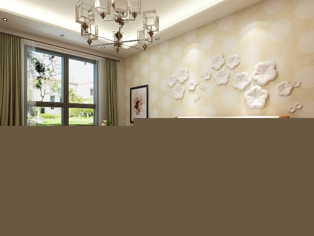 床頭暖黃色蒲公英的花紋的壁紙,白色五角梅的裝飾,使臥室盡顯優(yōu)雅唯美。