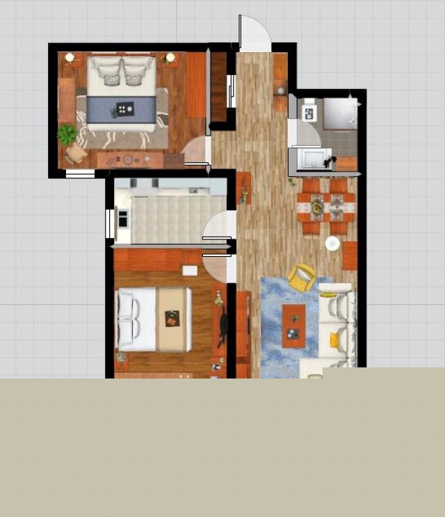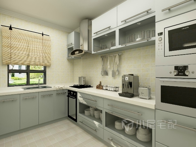 淡黃色墻磚,灰色方格地磚,竹卷簾,L型櫥柜,功能強大,簡單時尚。