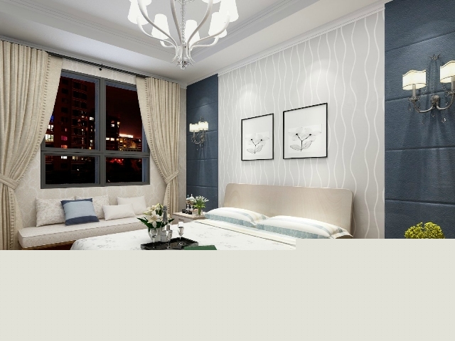 淡藍(lán)色的背景墻,顯得恬靜安逸,乳白色的窗簾,窗前的沙發(fā)凳,使整個(gè)臥室更加舒適柔美。