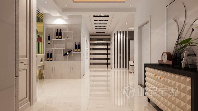 一進(jìn)門看見黑白搭配的吊頂和背景墻,好像吊頂和背景墻是一體的