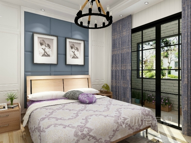 色彩和客廳呼應(yīng)的淡藍色的背景墻,顯得不那么生硬,使臥室空間顯得柔軟舒適。