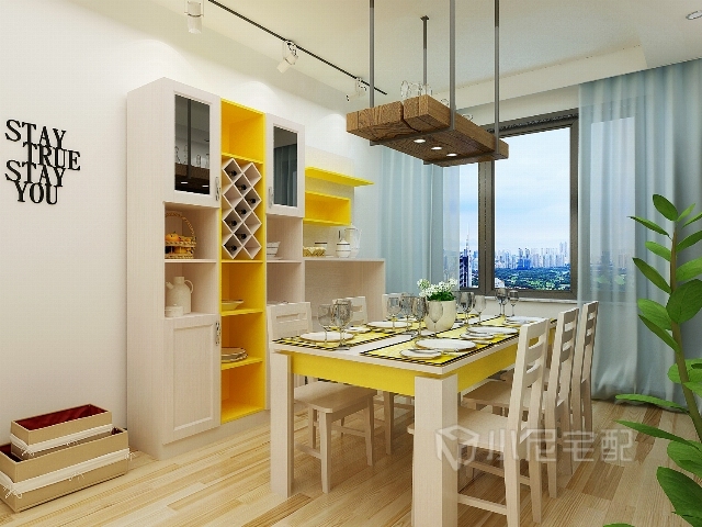 六人的長桌適合聚餐,家庭聚會,酒柜的設計增加裝飾和儲物的功能。