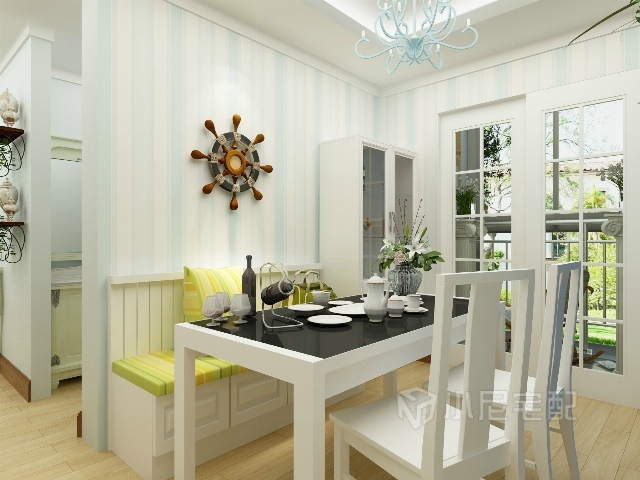 融入鮮艷的綠色,給人視覺(jué)的新意。墻上的地中海掛件,藍(lán)色的壁紙,給人清涼自然的感覺(jué)。