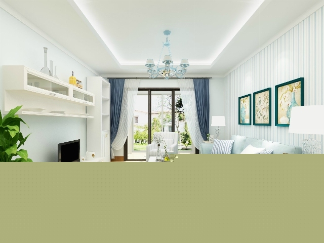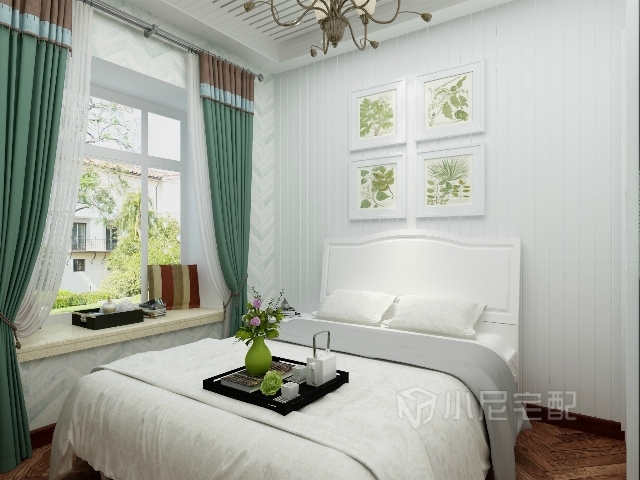 綠色的窗簾,白色的背景墻,綠植裝飾畫(huà),營(yíng)造自然清新的環(huán)境。